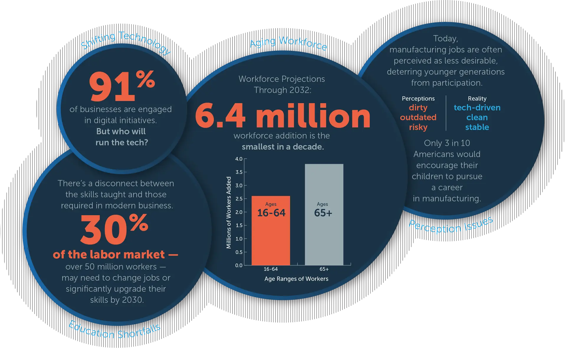 The manufacturing sector will need 3.8 million new workers in the next 10 years. However, if efforts aren’t made to attract more talent to modern manufacturing careers, nearly half of those positions — around 1.9 million —could remain unfilled. Of the total openings, approximately 2.8 million will result from retirements, while 760,000 will stem from industry expansion. Additionally, about 230,000 new jobs are expected due to recent policy and regulatory developments.